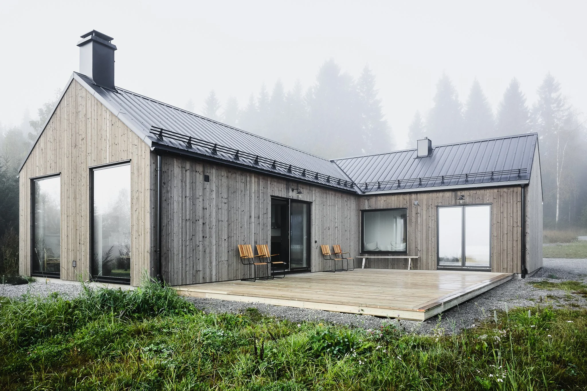 I byn Tjärnmyra har vi byggt ett fritidshus i massivträ med speciell hänsyn till skogstomten. Huset är ritat av Kockum Luttinger Söderström arkitektkontor.